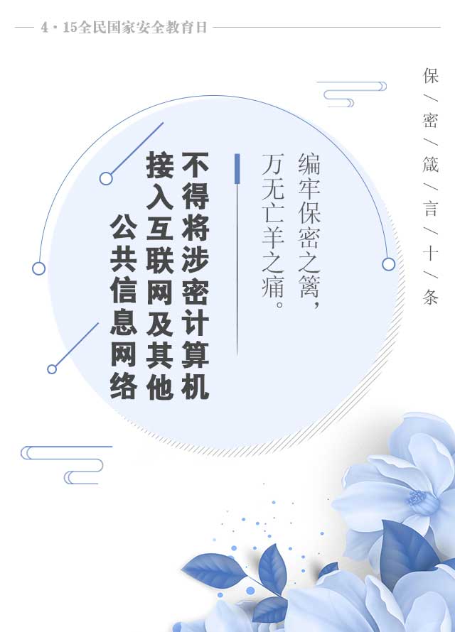 4個(gè)全民國(guó)家安全教育日。國(guó)家利益高于一切,國(guó)家安全人人有責(zé),希望大家將警鐘長(zhǎng)鳴耳邊,將保密牢記心間,現(xiàn)推出十條“保密箴言”。
